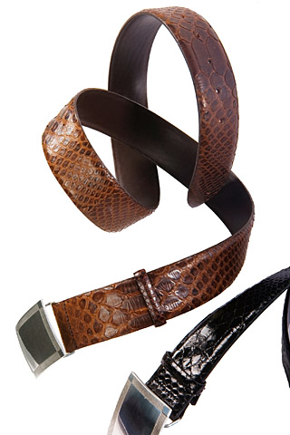 意大利奢侈品牌CANALI的蟒蛇皮皮帶一向頗受推崇。蟒蛇的紋路歷來給人以極度奢華的感官印象,鱗狀的紋路和肌理讓人在粗獷、豪放中,也能體會到精細的美。加之獨特染色工藝的運用,使得暗紅色和黑色均透露出五彩神韻,再配上簡潔大氣的方形金屬裝飾搭扣,展現出干練的男性魅力。(資料照片)