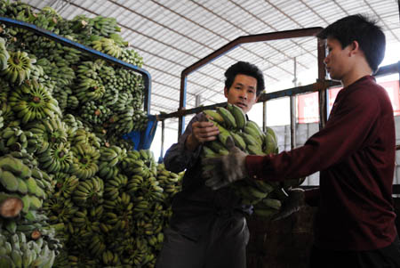隨著中國-東盟自由貿易區建設進程的加快,從憑祥口岸進出口的水果數量不斷增加。據海關統計,去年憑祥口岸對東盟國家水果進出口量達到83.68萬噸,貨值2.68億美元,進出口量占全國對東盟水果進出口量的28.9%,為排名第二的青島開發區口岸(共進出口40.69萬噸)的兩倍多,現已成為我國對東盟水果進出口的最大口岸。這是越南邊民在下卸從東盟進口的香蕉。
