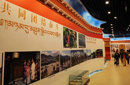 在云南省迪慶藏族自治州香格里拉縣,有一座在全國藏區獨具特色的紅軍長征博物館。該博物館重現了1936年4、5月間中國工農紅軍長征途經迪慶時的感人場景及70多年來雪域高原發生的巨大變化。目前該博物館已經成為迪慶藏區的愛國主義和革命傳統教育基地,每年吸引近10萬名中外游客和當地群眾前來參觀,成為香格里拉旅游的新亮點。這是一些游客在云南省迪慶藏族自治州香格里拉縣的紅軍長征博物館內參觀。