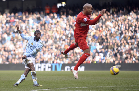 2008/2009賽季英格蘭超級聯賽第25輪,曼城隊主場1:0力克米德爾斯堡隊。圖為曼城隊球員肖·菲利普斯(左)起腳射門瞬間。