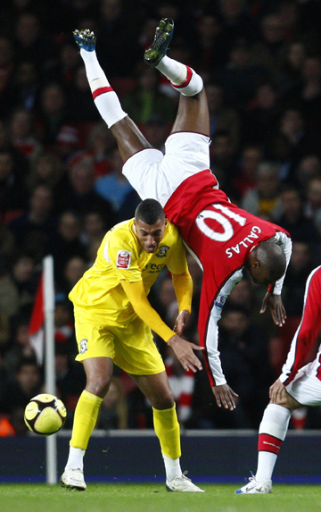 在英格蘭足總杯的一場比賽中,阿森納隊球員加拉斯(右)與加的夫城隊球員拼搶。