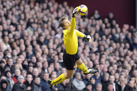 2008/2009賽季英超聯賽第25輪,曼聯隊客場以1比0戰勝西漢姆隊。圖為曼聯隊守門員范德薩在比賽中撲救。
