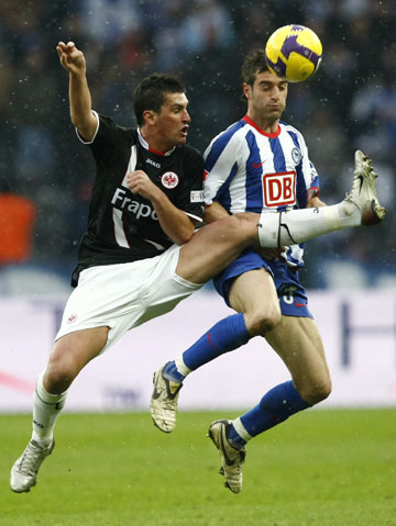德國足球甲級聯賽第18輪比賽,柏林赫塔隊球員尼庫(右)與法蘭克福隊球員費寧拼搶。