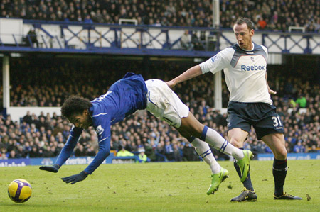 2008/2009賽季英格蘭超級聯賽第25輪,埃弗頓隊主場3:0完勝博爾頓隊。圖為博爾頓隊球員安·奧布里恩(右)在禁區對埃弗頓隊新租借球員約(Jo)犯規。 |