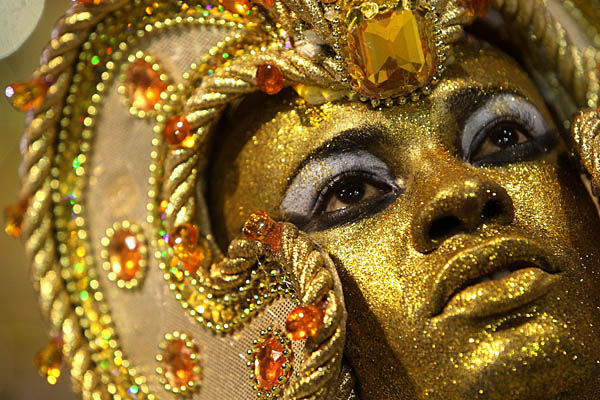 一名桑巴舞者的臉上涂滿金色的油彩。新華社/法新 |