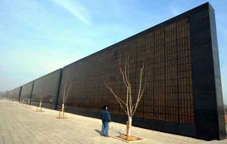 2月26日,一位年輕人在看地震紀念墻上的祭文。日前,河北省唐山市政府為更好地保護地震遺址,同時給廣大市民提供一個祭祀地震罹難者的場所,在建設中“唐山市地震遺址紀念公園”中建造的一座長約300多米,鐫刻上祭文和24萬罹難者姓名的地震紀念墻即將竣工。 1976年7月28日,河北唐山發生里氏7.8級地震,造成24萬人遇難。