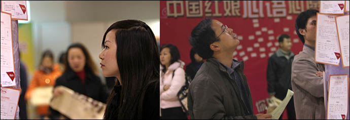 2月21日,中國紅娘(首屆)網絡交友節在杭州舉辦,活動當天吸引了不少單身男女。舉辦方“中國紅娘”網站為參加活動的單身男女策劃了各種活動和游戲,為他們提供相互了解、接觸的平臺。參加活動的以30歲左右單身男女居多,且多為上班族。有人抱著放松心情的目的,也有人來碰碰運氣,還有人懷著美好的愿望,希望找到自己的另一半。 活動開始后,有些人比較靦腆,不是在桌子旁干坐著,就是跑到后面去看墻上貼的別人的信息。在現場音樂以及主持人的帶動下,一些人逐漸放開了自己,加入到活動中來。在傳遞愛心的活動中,一位男士還在臺上引吭高歌,另一個游戲則要求男士只能動嘴巴和眼睛,由女士喂他們吃東西,這也吸引了好幾組人參加,現場笑聲不斷。不太愛說話的盛先生這次也有所收獲,他要到了幾位女士的聯系方式,準備活動后聯系。 三十來歲的阿戴,是中國紅娘網的注冊會員,聽說要舉辦網絡相親會,她也來到現場,準備找一個跟自己學歷、年齡、背景相當的人,可是今天她并沒有找到自己心儀的人,準備繼續留意網上的信息。 從事外貿行業的謝先生,第一次參加這樣的網絡相親會,不過他對網絡交友可不陌生,他經常在網上發布資料結交朋友。