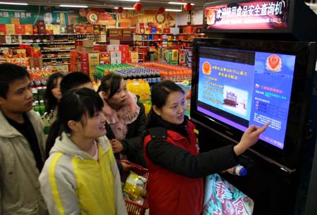3月11日,一名超市導購員(右一)向顧客演示食品安全查詢機的使用方法。 為健全食品安全體系,提高居民食品安全保障水平,山東省臨沂市近日在市區大中型商場超市安裝了食品安全查詢機。市民只需輕掃食品包裝上的條形碼,即可自助查詢食品質量信息,從而有效預防市民購買假冒偽劣和不合格食品的情況。