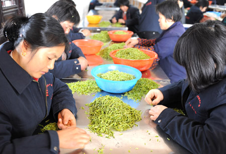 3月11 日,茶葉專業合作社的職工在分揀新摘的茶葉。 當日,享譽海內外的蘇州洞庭碧螺春茶在太湖洞庭東、西山開始陸續采摘。據專家介紹,隨著近期氣溫上升,一周后蘇州洞庭碧螺春茶將大批量應市,預計今年蘇州洞庭碧螺春茶產量為140多噸。洞庭碧螺春種植于太湖洞庭洞西山的果園之中,茶樹常年受太湖霧氣滋潤,并包吸四季花果之香,炒制的茶葉具有“條索纖細,卷曲成螺,茸毛遍體,銀綠隱翠”之外形和“湯色碧綠、入口爽甜、回味無窮”之內質,制作500克特級洞庭(山)碧螺春茶約需一芽一葉的嫩芽6萬個左右。