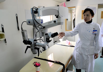 3月29日,工作人員介紹流動眼科手術車上的儀器。 當日,亞洲防盲基金會和香港圓玄學院向河南省捐贈“復明扶貧”流動眼科手術車儀式在河南鄭州舉行。河南省將通過捐贈的流動手術車每年為2000名白內障患者實施復明手術。