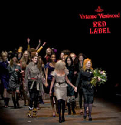 薇薇安·韋斯特伍德(右一)和展示她“淘氣校園女生”系列作品的模特一起登臺。新華社發(勇智毅 攝)