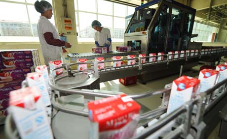 記者從近日召開的新疆穩定奶業發展工作會議上獲悉,新疆決定2009年新安排8010萬元財政資金,重點用于推進學生飲用奶計劃,實施乳品企業原料奶收購貸款貼息、奶粉儲備補助、乳品外銷儲運補貼。據了解,2008年10月以來,受國際金融危機和三鹿奶粉事件影響,新疆乳品企業積壓奶粉一度達到6000多噸。圖為新疆麥趣爾乳業有限公司包裝車間內,工人將生產出的袋裝奶裝箱。