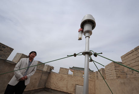 甘肅敦煌沙塵暴監測站日前投入使用,這是中國環境監測總站確定的80個沙塵暴監測站點之一,不僅能夠第一時間監測降塵、風向、風速、能見度等指標,還可及時準確地掌握和記錄沙塵暴產生和發展過程及對城市空氣質量的影響,為有效預防沙塵暴天氣提供可靠的資料。這是設在敦煌市區內的沙塵暴監測站點探頭。