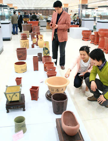 4月21日,在江蘇宜興舉行的“明清紫砂花盆收藏展暨當代名家名作展”上,參觀者欣賞獲獎的紫砂花盆。