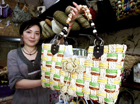 5月4日,蘇州市景德路旁一家草編工藝商店的工作人員展示一款草編女包。立夏將至,蘇州市場上推出的清涼又環保的草編女包深受女性顧客青睞。新華社發