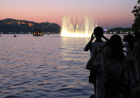 5月9日,杭州西湖游船黃昏游和夜游啟動,眾多游客爭相觀賞如夢如幻的“人間天堂”夜景。今年西湖夜游時間將持續到10月上旬。新華社發