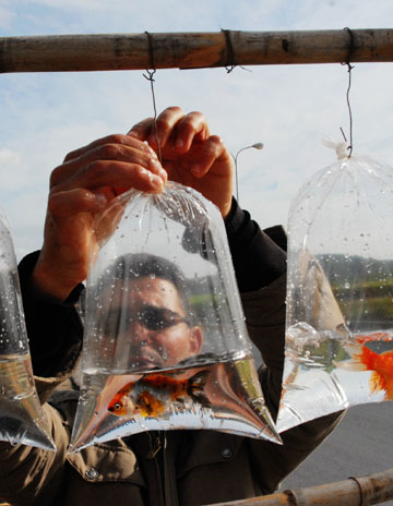 5月9日,在阿爾及利亞首都阿爾及爾街頭,一名攤主出售從中國進口的小金魚。近來,阿爾及爾街頭不少地方開始出售從中國進口的小金魚,水中游弋的小金魚為北非阿爾及爾增添了一絲清涼和趣意,受到當地居民的喜愛。新華社記者