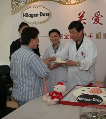 日前,哈根達斯攜手上海市瑞金醫院共同開展了“關愛·守護——乳腺癌的預防與保健”活動,以甜蜜的愛呵護媽媽們的健康。圖為瑞金醫院院長袁克儉為乳腺癌患者送祝福。