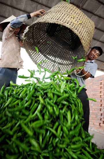 5月14日,欽州市那麗鎮農民在幫助收購商儲放辣椒。 2008年以來,廣西欽州市農民大力發展“避雨、避寒、避曬”的“三避”技術栽培辣椒獲得成功。今年種植的七萬多畝辣椒,預計產量達11萬噸,產值近三億元。目前已收獲的辣椒正通過各種途徑銷往全國各地。