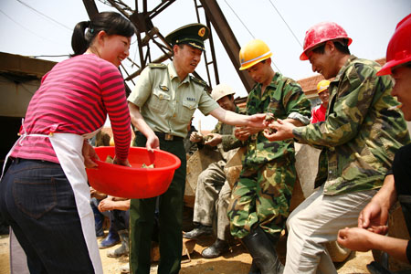 端午節即將到來,山東省乳山市邊防大隊開展“端午節送親情”活動,100余名民警利用周末帶著家屬來到轄區內的21個外來務工人員較多的工地,送去親手包的粽子和熟雞蛋,和工人們一起熱熱鬧鬧迎接端午佳節。