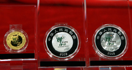 6月10日,中國人民銀行在滬舉行“中國2010年上海世界博覽會金銀紀念幣(第1組)”首發式.這套3枚一組的金銀紀念幣,其中1/3盎司金幣1枚,最大發行量50000枚;1盎司銀幣2枚,最大發行量70000×2枚。 中國金幣總公司在上海的特許零售商在首發式后將開展該套金銀紀念幣的店面銷售,同時中國金幣總公司各分支機構、直銷中心、各中國金幣特許零售商將面向全國和海外銷售。