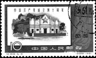 1961年7月1日,發行紀88《中國共產黨成立四十周年》紀念郵票,全套5枚,面值共0.72元,發行量150萬套。第一枚圖案是“一大”上海會址,第二枚是南昌八一大樓,第三枚是瑞金中央大禮堂,第四枚是延安寶塔山,第五枚是北京天安門。該票問世時間較早,現存量很少,市場價約600元。