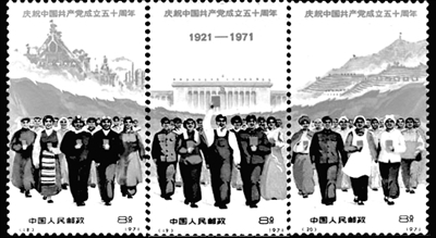 1971年7月1日,發行編12-20《慶祝中國共產黨成立五十周年》編號郵票,全套9枚,面值共0.78元,發行量320萬套。圖案分兩組,一組前6枚,分別是“一大”上海會址、廣州農民運動講習所、井岡山、遵義會議、延安、天安門;一組后3枚系連票,圖案是整幅“奮勇前進”圖。該票系“文革”期間發行,一套多達9枚,收集難度較大,市場價約850元。