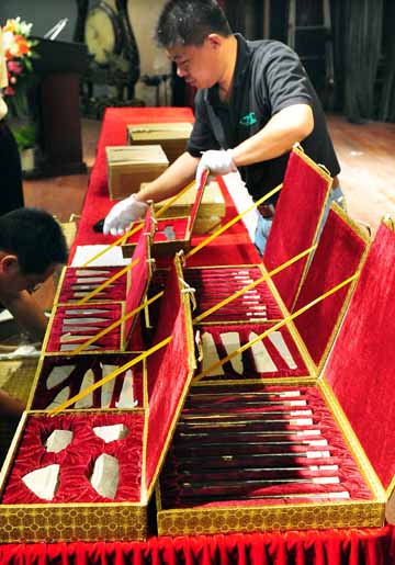 7月14日,工作人員在清點準備移交中國文字博物館的珍貴文物。 當日,河南省征調文物入藏中國文字博物館儀式在河南省博物院舉行。193件有關文字的珍貴文物被移交中國文字博物館收藏。 這批移交的文物包括河南博物院院藏“十六年鄭令”戈、銅“部曲將”印、曾子甗等123件文物和河南省文物考古研究所所藏的賈湖龜腹甲刻符、新蔡葛陵楚墓竹簡、溫縣盟書、長子口鼎、薳子昃鼎、平夜君成戈、垂球等不同歷史時期的各門類文物70件。