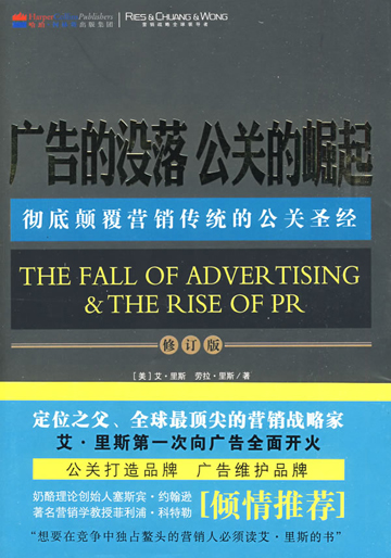 《廣告的沒落,公關的崛起》是營銷大師艾·里斯及其女兒勞拉·里斯2002年推出的經典之作,它體現了艾·里斯營銷思想的一個新理念:市場營銷要從公關開始,只有通過公關才能使自己的品牌在消費者心中占有一席之地。