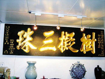 張松國還收藏有官匾、壽匾等不同類型的牌匾。他介紹,牌匾不僅是指示標志,更是文化身份的標志。歷史上它就廣泛應用于宮殿、牌坊、寺廟、商號、民宅等建筑的顯赫位置,向人們傳達皇權、文化、人物、信仰、商業等信息。比如說人們比較熟悉的商業領域的牌匾,它們往往是通過巧取文學作品、憑借商聯文采、援引成語典故、附著神話傳說、名人題字等方式,抓住人們傳統的趨吉心理,以此來表達店家對客人的報恩情感,同時也顯示店家誠信。一塊有分量的牌匾,能極大提升店家的整體形象。
