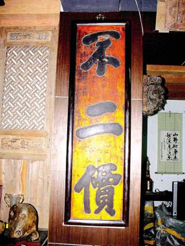 內文是飽滿圓潤,柔中帶剛的三個字———“不二價”,匾的面上均勻分布金漆,匾身以名貴的紫檀木包邊,這塊明清時期紫檀邊框“不二價”匾是典型的古代商業牌匾。光從字面上理解,許多看過這塊匾的人都猜測,過去是放在典當鋪里作為鎮店之寶的。如今,這塊匾被藏家張松國所得。當初他在一條古玩街上看到這塊老匾的時候,一眼就看出了材質上的不凡之處,等店老板開了價便二話不說買走了。此后還多方面查找資料尋找出這塊老匾的來歷,目前已有一些眉目需要進一步的證實。這塊老匾,仔細摸會發現匾身內里似乎夾有東西,估計是紙張文書一類,如果取出來看必定大有發現。但是,考慮到貿然動手,會損壞老匾的整體外觀,所以就沒有刻意在其身上尋找證據。