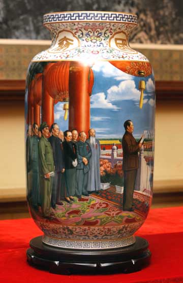 7月20日,江山如此多嬌-新中國60年華誕國瓷藝術展首展在北京全國政協禮堂舉行。為慶祝新中國成立60周年,中國文物學會收藏鑒定委員會組織景德鎮瓷藝大師創作了以“江山如此多嬌”為主題的系列國瓷藝術品。展覽共包括兩件主題創作瓷藝大器“江山如此多嬌”“開國大典”和17件高仿藝術品。圖為“開國大典”瓷藝大器。