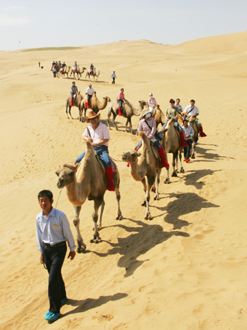 7月28日,游客在內蒙古響沙灣旅游景區騎駱駝游玩。 時下正值內蒙古夏季旅游旺季,內蒙古鄂爾多斯市響沙灣旅游景區以其獨特的沙漠景觀和民族風情吸引游人。這里的篝火晚會、民族舞蹈、騎駱駝、滑沙等特色旅游項目深受游人喜愛。
