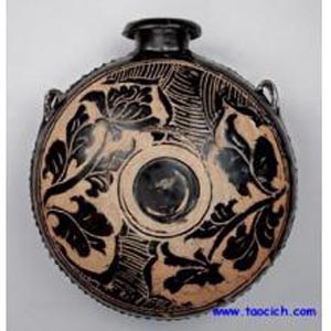 扁壺產品數量大,制作精美,也是西夏以外其它瓷窯所沒有的,是西夏瓷器中最具代表性的典型器。扁壺有兩種,較大者為圈足扁壺,壺口小、頸短、腹扁圓,壺中盛酒、水或奶不易溢出。另有一種小型扁壺,其器形與大型扁壺相似,不置圈足,體態輕盈,腹側置雙耳,穿帶隨身攜帶簡便實用。扁壺無論大小,設計合理制作精美,體現了黨項人的聰明才智。
