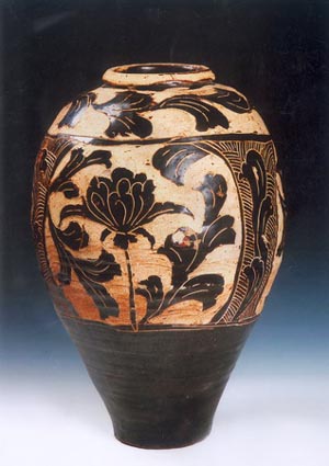 西夏瓷最典型的特征是在瓷器上剔刻花紋,這種瓷器也是西夏瓷中最為精美的一種。西夏制瓷工匠在進行剔刻花工藝時,一般有兩道工序:第一道工序是刻花,刻花不是在平面上繪畫,而是直接在上好釉的器體上,用刻刀刻繪花紋和圖案的輪廓,難度很大。第二道工序是第一道工序的延續,即剔釉,是將所要表現的花紋圖案周圍多余的釉剔掉或刮掉,露出胎體。在西夏剔刻花瓷器上,最為顯著的是紋有各種各樣的牡丹花。據一些收藏家介紹,當時的西夏境內并沒有這種花卉,瓷器上大量紋牡丹很是費解。