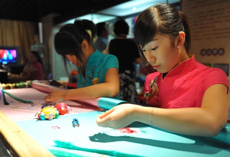 8月16日,北京劇裝廠的工作人員在現場展示“燕京八絕”之一的京繡。當日,第二屆中華民族藝術珍品文化節在位于北京崇文區的中華民族藝術珍品館開幕。據介紹,為期一月有余的此次文化節包括藏傳佛教藝術珍品展、海外遺珍———海峽兩岸紅山玉文物瑰寶展、“燕京八絕”傳統技藝展等七個主題展以及古玉鑒定講座、藝術珍品拍賣等多項活動,將系統地展示反映中國古代、近現代和當代民族藝術的珍品。