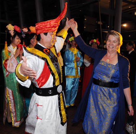 8月23日,在新西蘭南島最大城市克賴斯特徹奇,新西蘭國會議員瓦格納(右)在文化節晚會上與演員翩翩起舞。由當地華人社團組辦的“印象中國”文化節暨中華人民共和國建國60周年慶;顒赢斎赵谛挛魈m南島最大城市克賴斯特徹奇舉行。