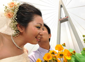在開闊的上海展覽中心內,琳瑯滿目的婚紗禮服、精致藝術的婚紗攝影、款式各異的喜糖請柬、豪華氣派的酒店婚宴、體貼周全的婚禮公司以及價格不菲的結婚房產、黃金珠寶等“一條龍”式現代婚禮產業,在展會現場應有盡有。