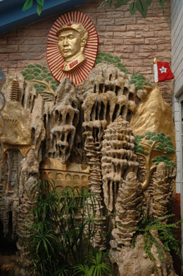 他用自己收藏的毛主席像章拼成了一幅中國地圖,并在屋頂花園內,按照地理方位和比例建造了一條紅軍長征路,從瑞金到吳起,途經的遵義、毛兒蓋等重要地點一應俱全,紅軍井、古樹、碑刻、山水等形象逼真,他還特意請來遵義市老紅軍王道金簽名題字。
