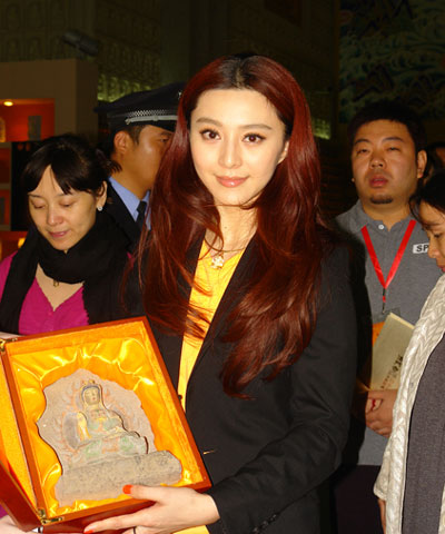 著名影星范冰冰在佛文化藝術展手捧磚雕佛像