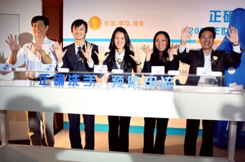 衛生部應急辦張國新副主任、中國健康教育中心衛生部新聞宣傳中心陶茂萱副主任、中國紅十字會賑濟部王平部長、舒膚佳品牌總監周濤、舒膚佳健康大使楊揚5人共同演示正確洗手方法。本報記者
