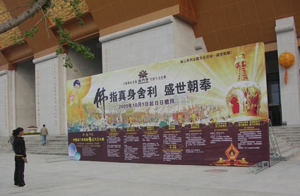 為了迎接新中國六十華誕,祈福和諧盛世,以“和韻中國”為主題的法門寺首屆佛文化藝術展9月29日至10月30日舉辦。薈萃了千余件中國佛文化藝術領域頂級水準的磚雕、繪畫、琉璃、瓷器、唐卡等珍品,分屬于法門寺地宮珍寶藝術展、首次面世的法門寺舍利真身寶塔磚雕藝術、琉璃藝術家楊惠姍20年琉璃佛像展和佛教陶瓷藝術展等專題中。包括“香云寶爐”、柴窯粉青浮雕描金象耳爐等禮器在內的這些最具代表性、最能體現佛教文化特色的古今藝術珍品,大部分是首次在中國大陸展出,本次國家級別的展出規格也無先例。有20多萬人海內外游客云集佛教圣地法門寺,盛況空前。評論認為,法門寺佛文化藝術展預示著一次源于東方的佛教文化世界之旅正式啟航。