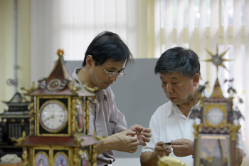 陳東和(左)向北京故宮的“師傅”秦世明學習清代宮廷鐘表的維修。新華社記者 邢廣利