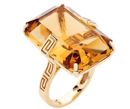 ▲范思哲的DAFNE指環系列采用了紅金、黃金及白金等不同材質,綴飾深色紫晶及灼爍石英。寶石的琢面獨特而耀目,配合以精工細造的希臘萬字圖案,成就了完美的鏤嵌效果。
