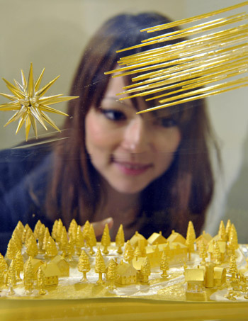 ▲在日本東京舉行的一個金銀工藝品展覽上,一名女觀眾端詳展品《星語心愿》。這一作品高30厘米,重15千克,由純金制成,市場價約130萬美元。新華社/法新
