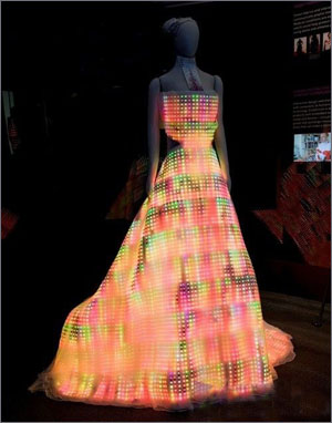 uteCircuit)公司設計師弗蘭切絲卡·羅塞利亞和瑞安·根茨受美國芝加哥科學和工業博物館委托,設計一件代表時尚創新的服裝,于是催生了這件嵌有2.4萬個發光二極管的晚禮服。 它有一個貼切的名稱——銀河晚禮服。 該款晚禮服雖然綴滿發光二極管,卻不笨重:每個發光二極管都像紙一樣薄,長2毫米。連接二極管的電路設計得尤其輕薄,手工縫制在一層絲綢上,以便伸展。 設計師說,發光二極管應用的新技術不會使裙子溫度過高,想穿“銀河晚禮服”的超級時尚迷們不會感覺炙熱。另外,發光二極管耗能低,裝在襯裙里的小充電電池足夠點亮它們。