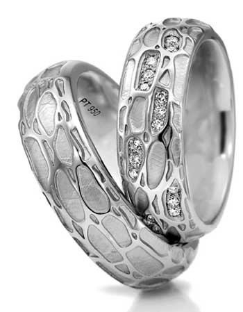 由PeterH eim設計的C roconuts鉑金婚戒(Pt950)表面紋理極富質感,鑲嵌有專門為“她”而呈現的明亮琢型鉆石。在2009InhorgentaE urope國際珠寶展覽會上,該款設計榮獲了國際鉑金協會(P G I)德國分會授予的鉑金婚戒類“2009最受歡迎鉑金設計”大獎。
