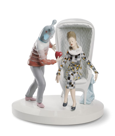 雅致新作Lladró夢幻系列之魔法時刻集夢幻與現實感于一身,詮釋了最坦率真摯的愛情姿態。同樣以JaimeHayón設計生涯中最具代表性的設計元素——Showtime扶手椅作為創作基礎。這款作品的設計非常精妙,一位曼妙的女郎坐在扶手椅上,愛情魔法師為了向女郎表達自己的愛意,將自己的心作為禮物獻給她。這件作品是整個Fantasy夢幻創品系列中的重點之作,完美地結合了Lladró與JaimeHayón的藝術風格。