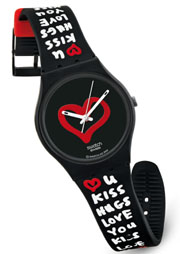 Swatch邀請來自紐約的畫家、設計師馬修·朗吉勒(MatthewLangille)以愛心凝聚歡快的風格演繹出浪漫宣言。馬修以直白的紅黑兩色繪制出明快而勇敢的心。 時尚的黑色表盤托起涂鴉式紅心,吸引了眾人注意。表盤上未出現任何數字與刻度,優雅簡約的指針見證了愛情的每一個甜蜜瞬間。黑色腕帶上所繪制的紅白相間信息,宛若只有愛人才能領悟的愛情密碼。