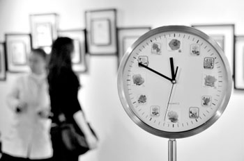 山東收藏家林一葦為虎年春節獻上19年收藏的愛情郵票,讓愛的溫暖和祝福陪伴廣州市民度過浪漫春節,《玫瑰花的問候——世界愛情郵票環球展》2月6日至28日在廣州購書中心展出。據悉,林一葦先后投資六、七百萬元一共收藏了136個國家和地區的30萬余枚以愛情為主題的郵票,此次展出的是其中的4000余枚。圖為展廳內隨處可見的愛情郵票時鐘。新華社記者 梁志瑋/攝